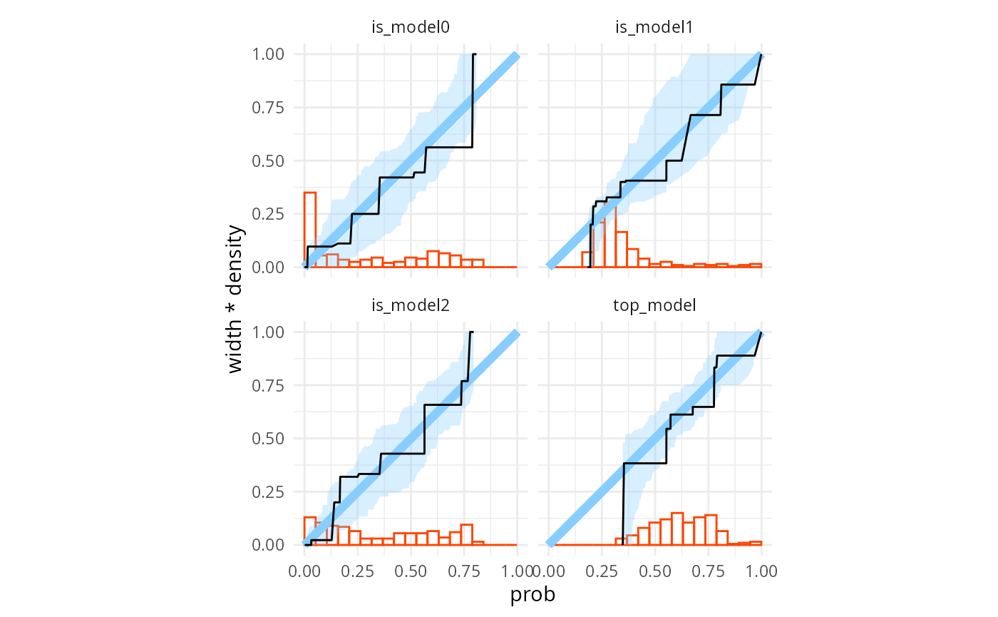 Additionally, we may also employ diagnostics specific for binary variables, like testing if the predictions are calibrated, e.g. that whenever posterior probability of model 1 is 75%, we expect the model 1 to generate the data in about 75% of the cases. We may also test the data-averaged posterior, i.e. that the average posterior model probability is equal to the prior model probability.